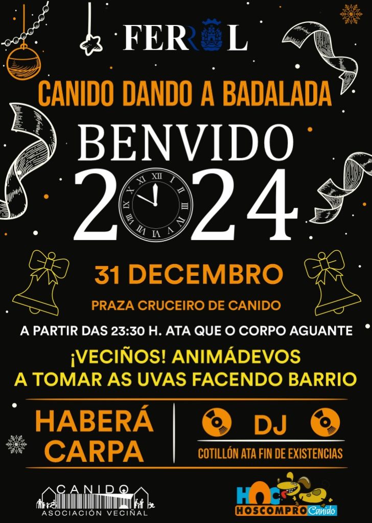 O vindeiro 31 de Decembro na praza do cruceiro de canido teremos as uvas e festa a partir das 23:30 horas, con carpa incluída, DJ e cotillón.