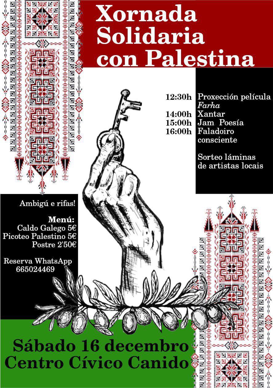 O vindeiro 16 de decembro teremos unha xornada solidaria con Palestina, que comezará ás 12:30 horas coa proxección da película Farha, e despois dun xantar ás 14;00 o Centro Cívico acollerá unha Jam Poesia e posteriormente un Faladoiro consciente. Máis información no cartaz da esquerda.