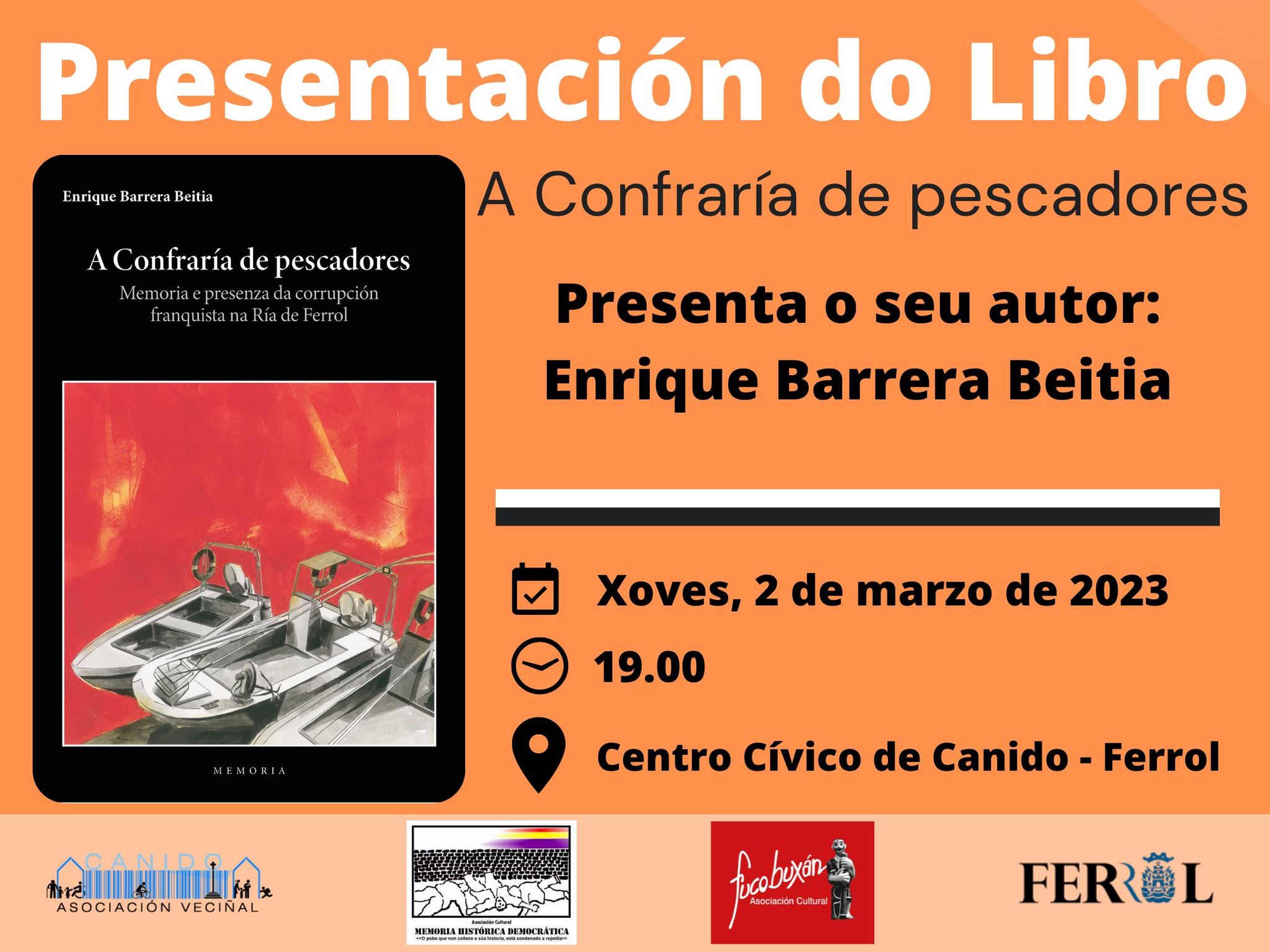 O xoves 2 de marzo preséntse no Centro Cívico o libro “A confraría de pescadores. Memoria e presenza da corrupción franquista na ría de Ferrol” Presentará o e autor, Enrique Barrera Beitia Lugar, Centro Cívico de Canido o 2 de marzo de 2023 ás 19.00h. Non faltedes facebook.confraría facebook.actividade